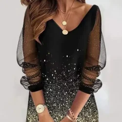 فستان نسائي من الشاش بتصميم ربيعي جديد موديل 2024 برقبة دائرية مزين بالترتر ومنظور