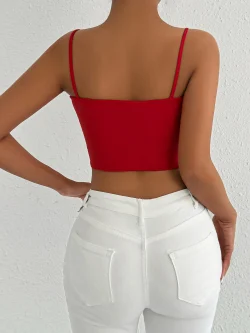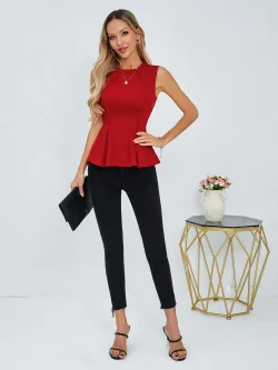 بلوزة نسائية بدون أكمام باللون الأحمر ورقبة دائرية وحاشية بيبلوم بقصة ضيقة للربيع والصيف أنيقة وعصرية ومناسبة للمواعدة اليومية