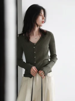 شيك فين سترة نسائية عصرية ريترو جديدة بياقة على شكل حرف v سترة محبوكة مخططة بقصة ضيقة وأكمام طويلة سترة نسائية لربيع وخريف 2025