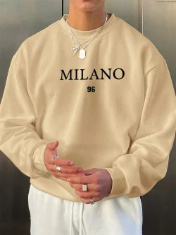 بلوفر رجالي خريفي وشتوي مخملي سميك دافئ وعصري فضفاض ميلانو 96 مطبوع برقبة دائرية وأكمام طويلة