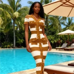 فستان نسائي أنيق مخطط برقبة على شكل حرف V صيفي بأكمام قصيرة ومتماسك بشرابة فساتين ضيقة للنساء