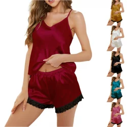 ملابس نوم نسائية مثيرة قطعتين بيجامة بلون واحد مع حمالات دانتيل ملابس نوم ملابس منزلية أوروبا وأمريكا