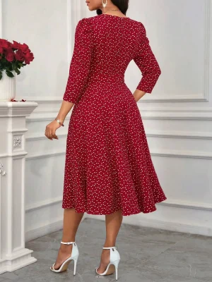 فستان ميدي ربيع وصيف للنساء باللون بورجوندي بنقاط البولكا، بأكمام ثلاثة أرباع، وياقة على شكل V، بقصة A، أنيق وكاجوال، فستان يومي وحفلات